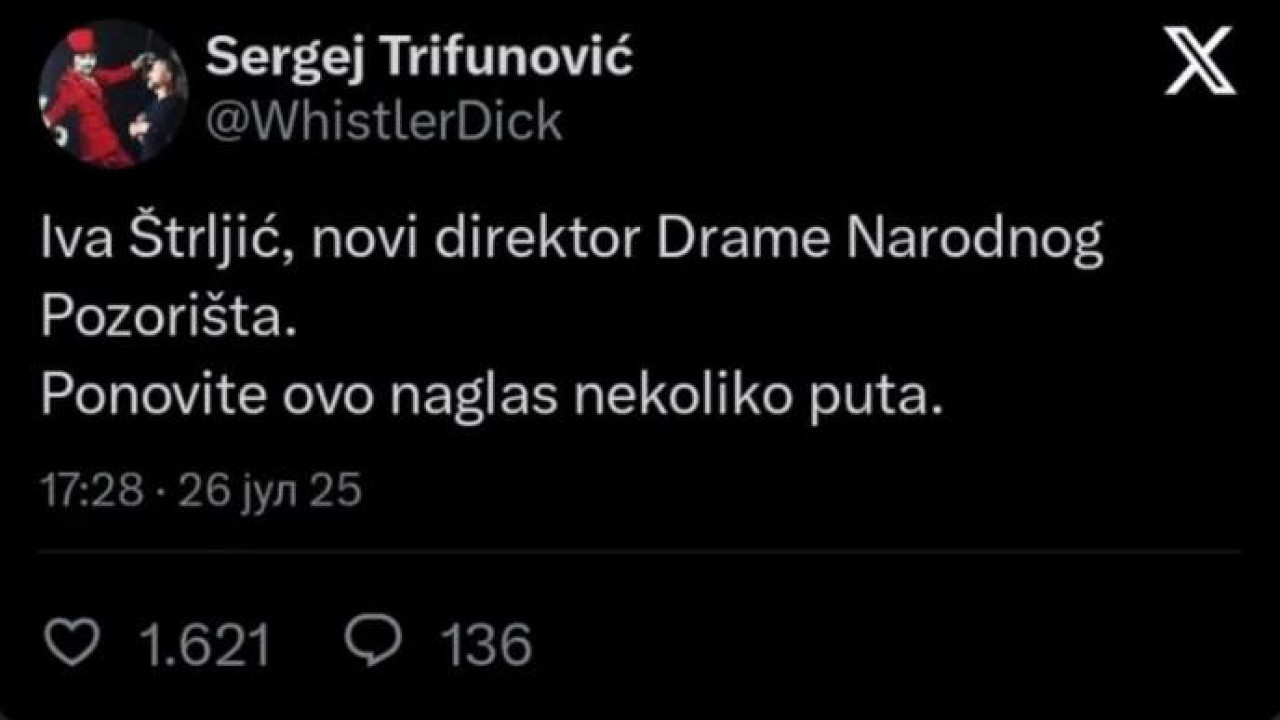 - Iva Štrljić, novi direktor Drame Narodnog pozorišta. Ponovite ovo naglas nekoliko puta - napisao je glumac na društvenoj mreži Iks.