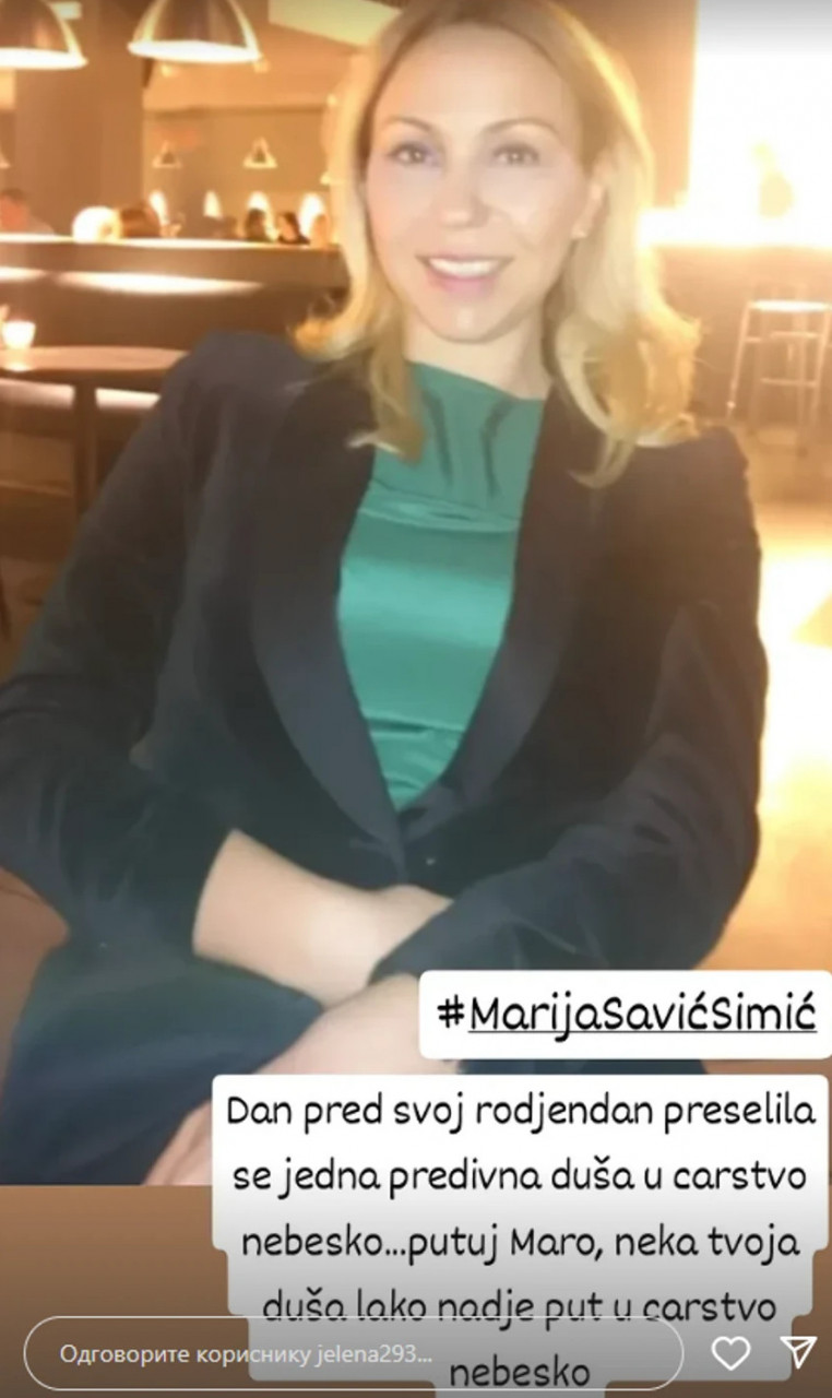 Inače, drugarica Marije Savić Simić na svom Instagram profilu napisala je uz oproštajne reči da je ona preminula dan pred svoj rođendan.
