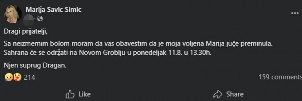 - Dragi prijatelji, sa neizmernim bolom moram da vas obavestim, da je moja voljena Marija juče preminula. Sahrana će se održati na Novom groblju u ponedeljak, 11.8. u 13 i 30. NJen suprug Dragan - stoji u saopštenju koje je objavio na njenom Fejsbuk profilu.
