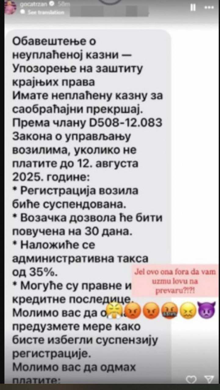 Poslednjih dana, građani Srbije suočavaju se sa talasom lažnih SMS poruka u kojima se traži uplata "zaostalih kazni". Goca Tržan, koja je dobila jednu ovakvu poruku, odmah je reagovala.