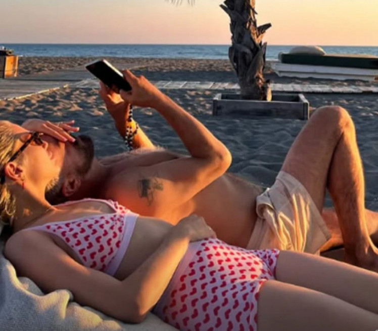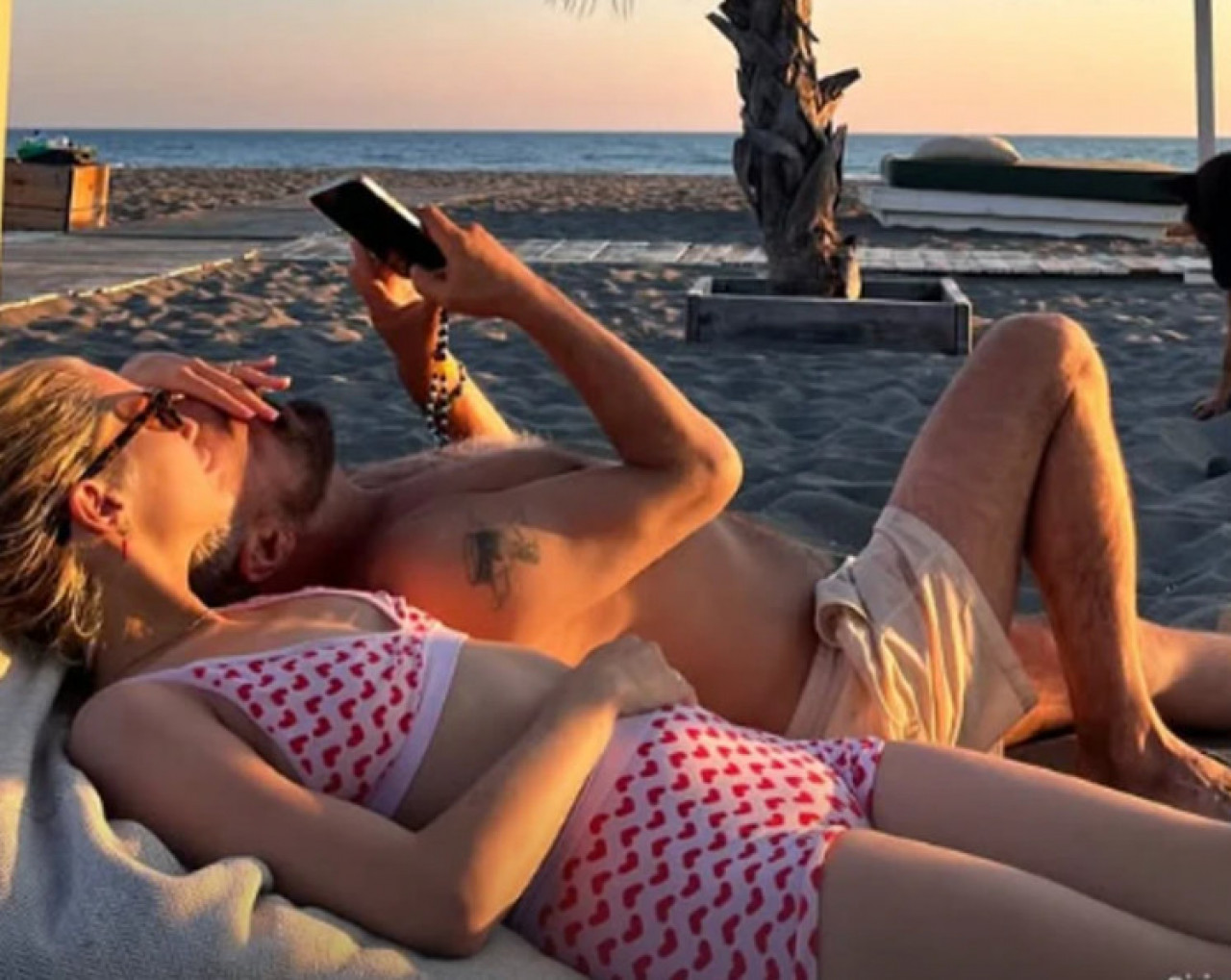 Isidora je imala na sebi neobičan kupaći kostim sa srcima, dok je Sergej bio u bermudama i gledao je u telefon.