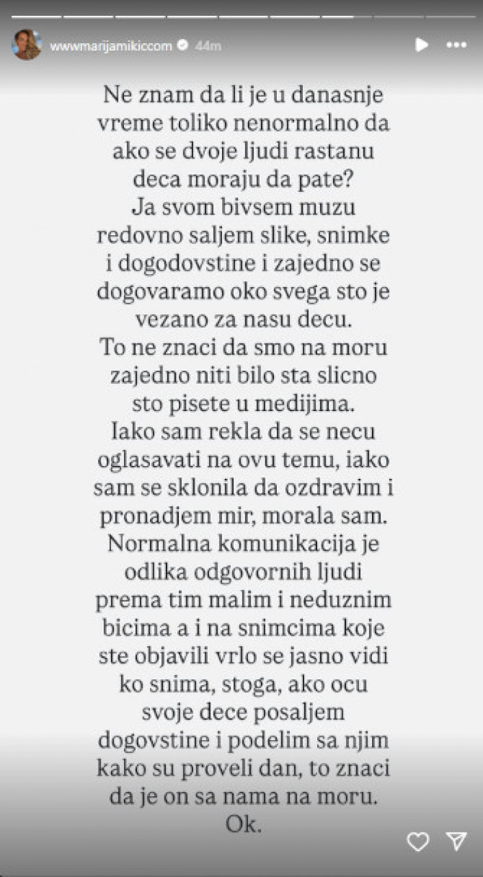 - Ne znam da li je u današnje vreme toliko nenormalno da, ako se dvoje ljudi rastanu, deca moraju da pate? Ja svom bivšem mužu redovno šaljem slike, snimke i dogodovštine i zajedno se dogovaramo oko svega što je vezano za našu decu. To ne znači da smo na moru zajedno, niti bilo šta slično. Iako sam rekla da se neću oglašavati na ovu temu, iako sam se sklonila da ozdravi,, morala sam. Normalna komunikacija je odlika odgovornih ljudi prema tim malim i nedužnim bićima - napisala je između ostalog Marija.
