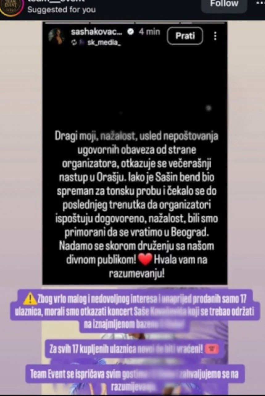 - Zbog vrlo malog i nedovoljnog interesovanja i unapred prodatih samo 17 ulaznica, morali smo otkazati koncert Saše Kovačevića koji je trebalo da se održi na iznajmljenom bazenu. Za svih 17 kupljenih ulaznica novac će biti vraćen! Zahvaljujemo se na razumevanju - pisalo je u saopštenju kluba.