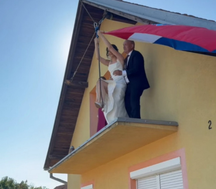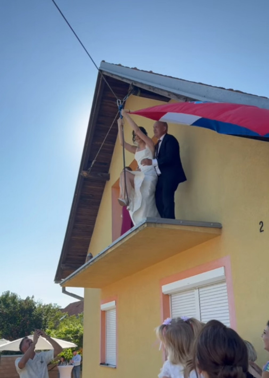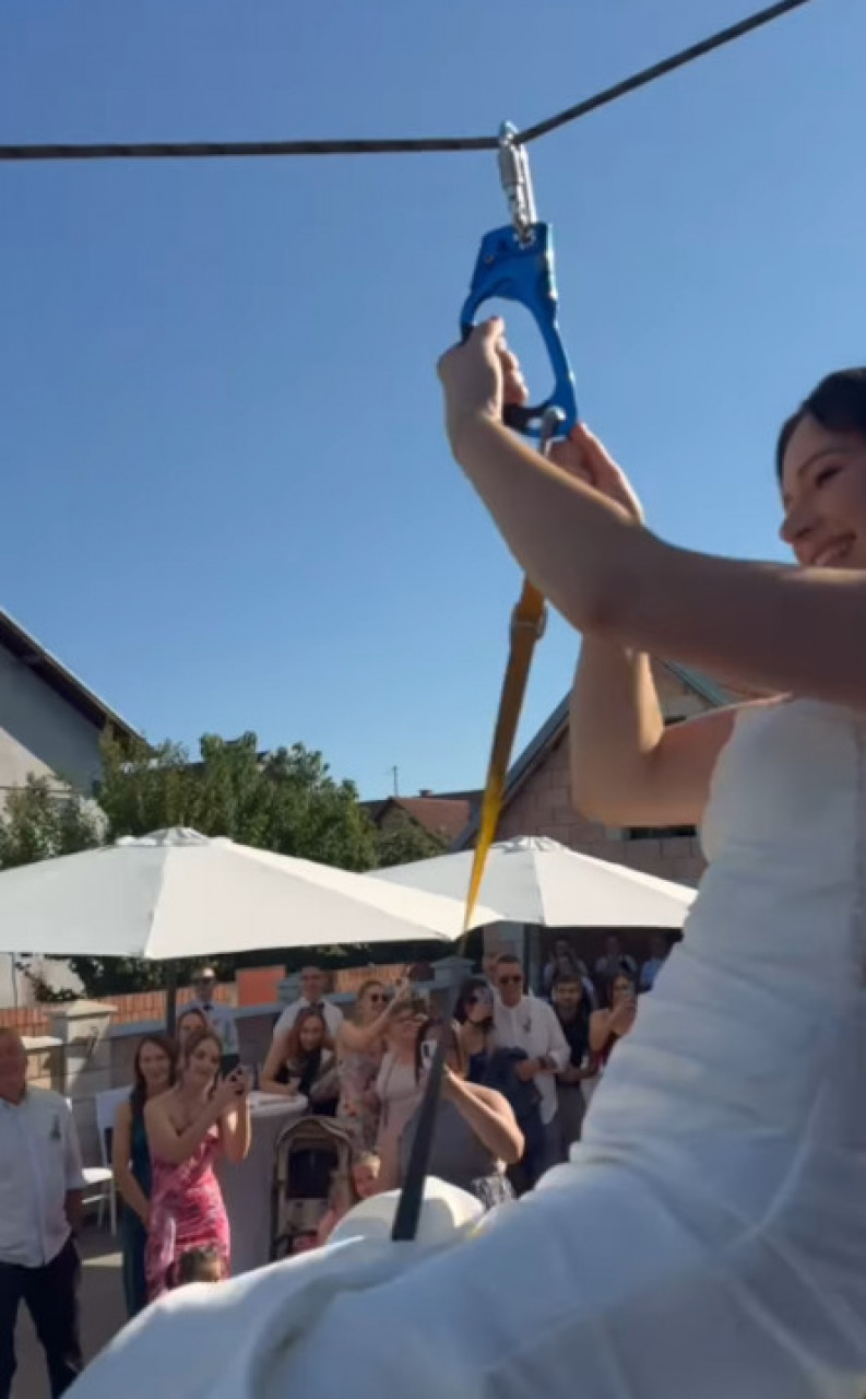 Umesto da korača ka gostima, spustila se sa balkona kuće zip-lajnom, u dugačkoj beloj venčanici i visokim štiklama, pravo među svoje prijatelje i porodicu.