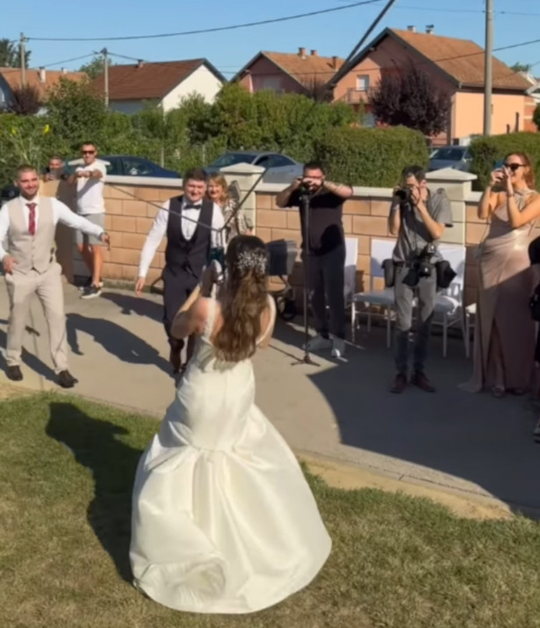 Na video-snimku vidi se kako mlada elegantno "leti" ka okupljenima, a aplauz ne prestaje.