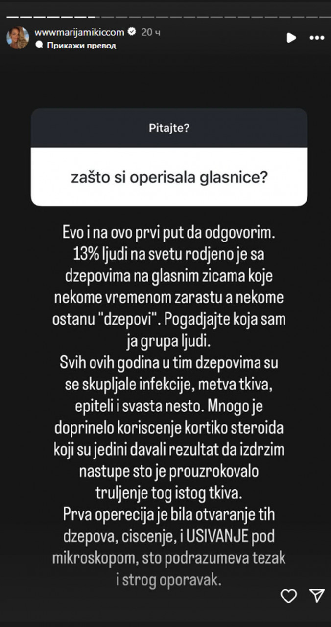 - Inače, 13 odsto ljudi na svetu rođeno je sa džepovima na glasnim žicama koje nekome vremenom zarastu, a nekome ostanu "džepovi". Pogađajte koja sam ja grupa ljudi. Svih ovih godina u tim džepovima su se skupljale infekcije, mrtva tkiva, epiteli i svašta nešto. Mnogo je doprinelo korišćenje kortikosteroida koji su jedini davali rezultat da izdržim nastupe, što je prouzrokovalo truljenje tog istog tkiva - navela je Marija odgovarajući na pitanja ljudi na Instagramu.