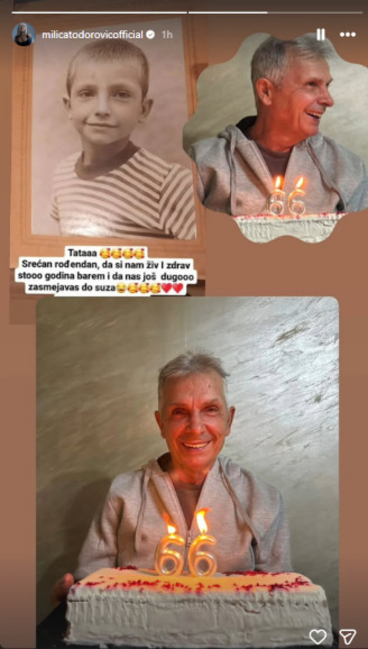 - Tata, da si nam živi i zdrav, sto godina barem i danas još dugo zasmejavaš do suza - stoji u objavi Milice Todorović, a na kojoj njen otac drži rođendansku tortu u rukama.
