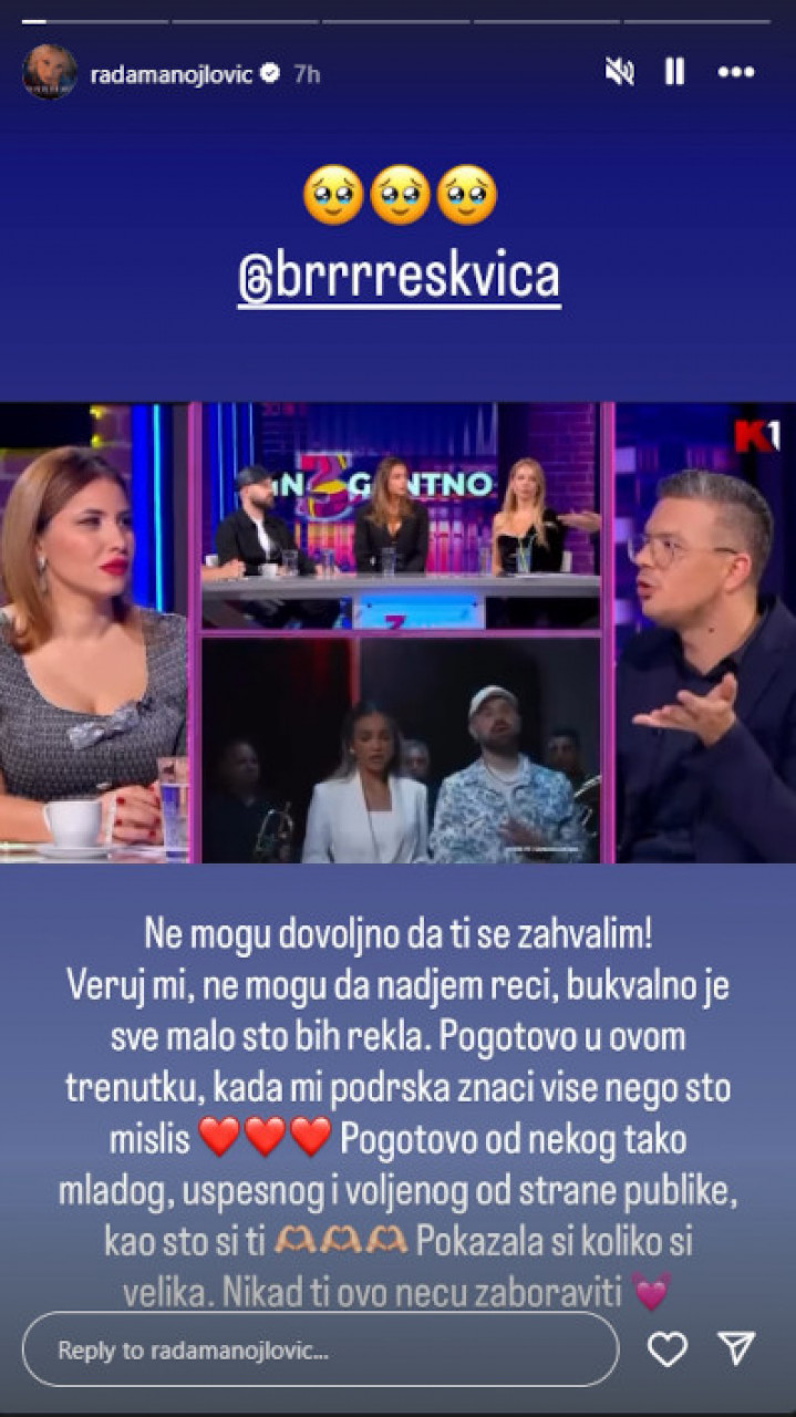 - Ne mogu dovoljno da ti se zahvalim. Veruj mi, ne mogu da nađem reči, bukvalno je sve malo što bih rekla. Pogotovo u ovom trenutku kada mi podrška znaći više nego što misliš. Pogotovo od nekog mladog, uspešnog i voljenog od strane publike kao što si ti. Pokazala si koliko si velika, nikada ti ovo neću zaboraviti - napisala je Rada na Instagramu.
