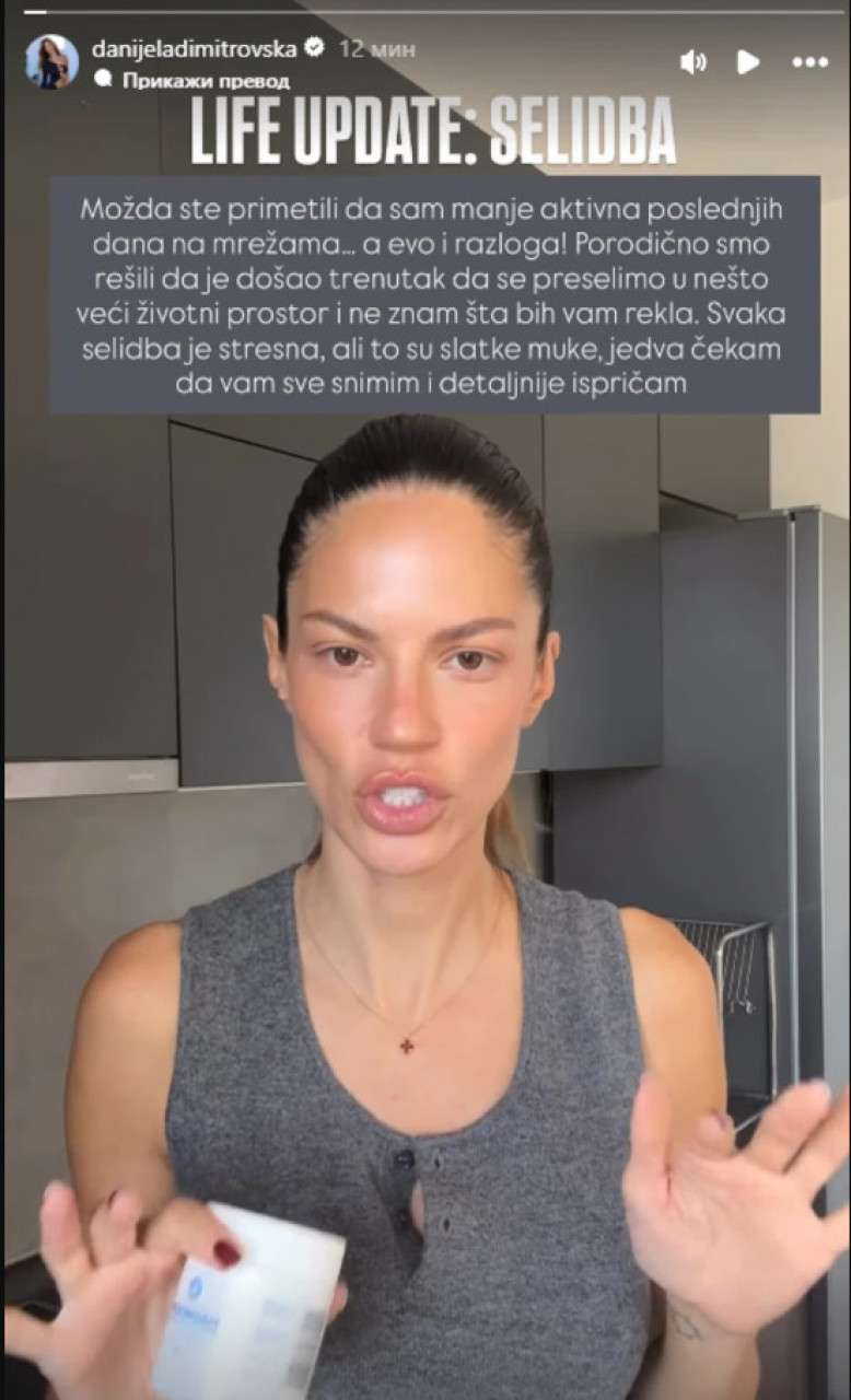 "Ne znam odakle da počnem... Mi smo porodično rešili da je došao trenutak da se preselimo u veći životni prostor. Ovde smo u Jevremovoj kući. Dok je Mata u Parizu izabrali smo ovaj trenutak da njemu bude što manje stresno, da ne učestvuje u tome", rekla je manekenka u video klipu.