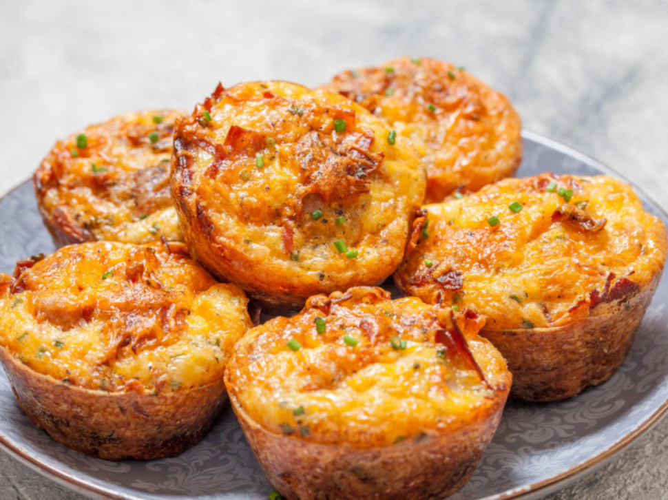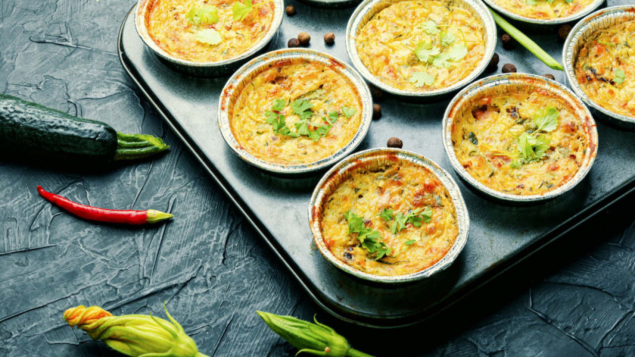 Rernu zagrejte na 190 stepeni. U jednoj velikoj činiji umutite jaja i sveži sir u kompaktnu smesu.Zatim dodajte povrće, so, biber i beli luk u prahu, pa dobro promešajte. Smesu sipajte u kalup za mafine. Pecite mini omlete 20 do 25 minuta, u rerni zagrejanoj na 190 stepeni.