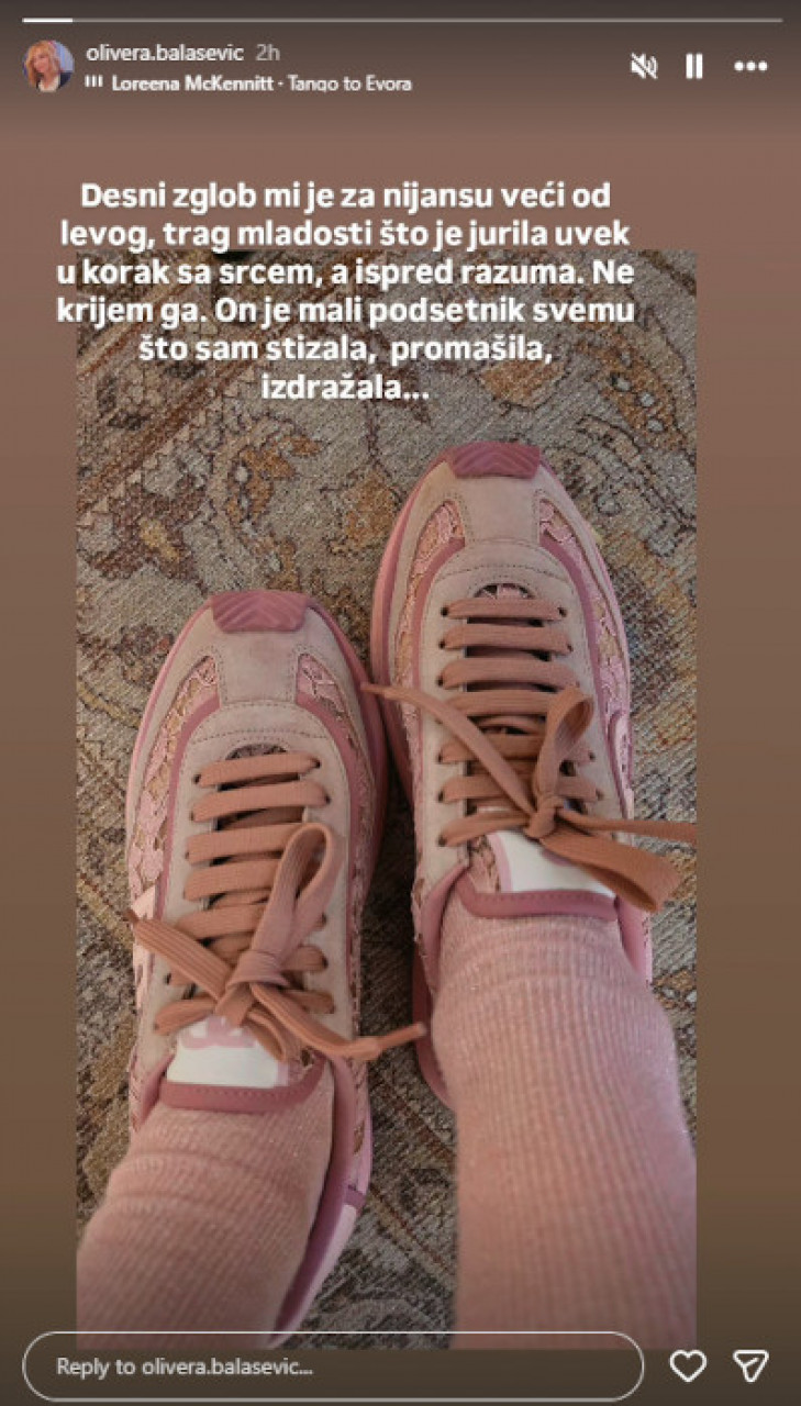 - Desni zglob mi je za nijansu veći od levog. Trag mladosti što sam jurila uvek u korak sa srcem, a ispred razuma. Ne krijem ga. On je mali podsetnik svemu što sam stizala, promašila i izdržala - napisala je ona.