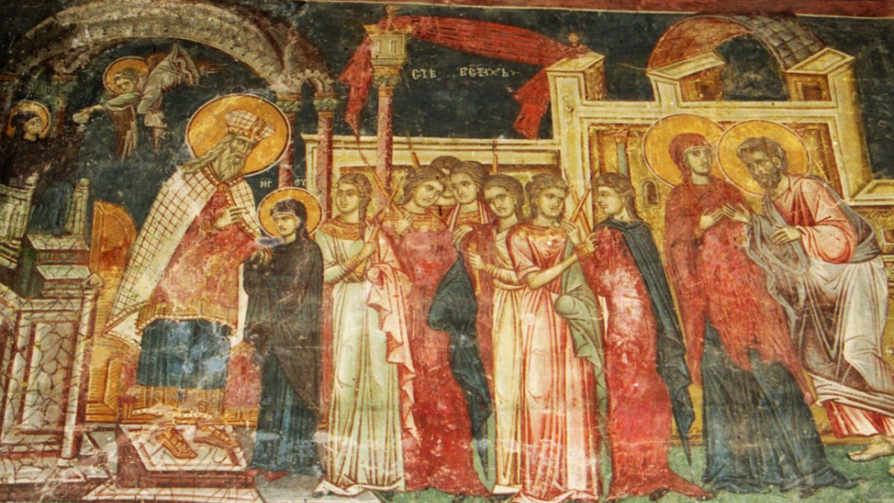 "O, Presveta Đevo, Carice nebesa i zemlje, pre svih vekova izabrana Nevesto Božija, Koja si u poslednja vremena došla u hram zakonski, radi obručenja sa Nebeskim Ženikom! Ti si napustila narod Svoj i dom oca Svojega, da bi Sebe prinela Bogu kao žrtvu čistu i neporočnu, i prva dala obećanje svagdašnje devstvenosti.