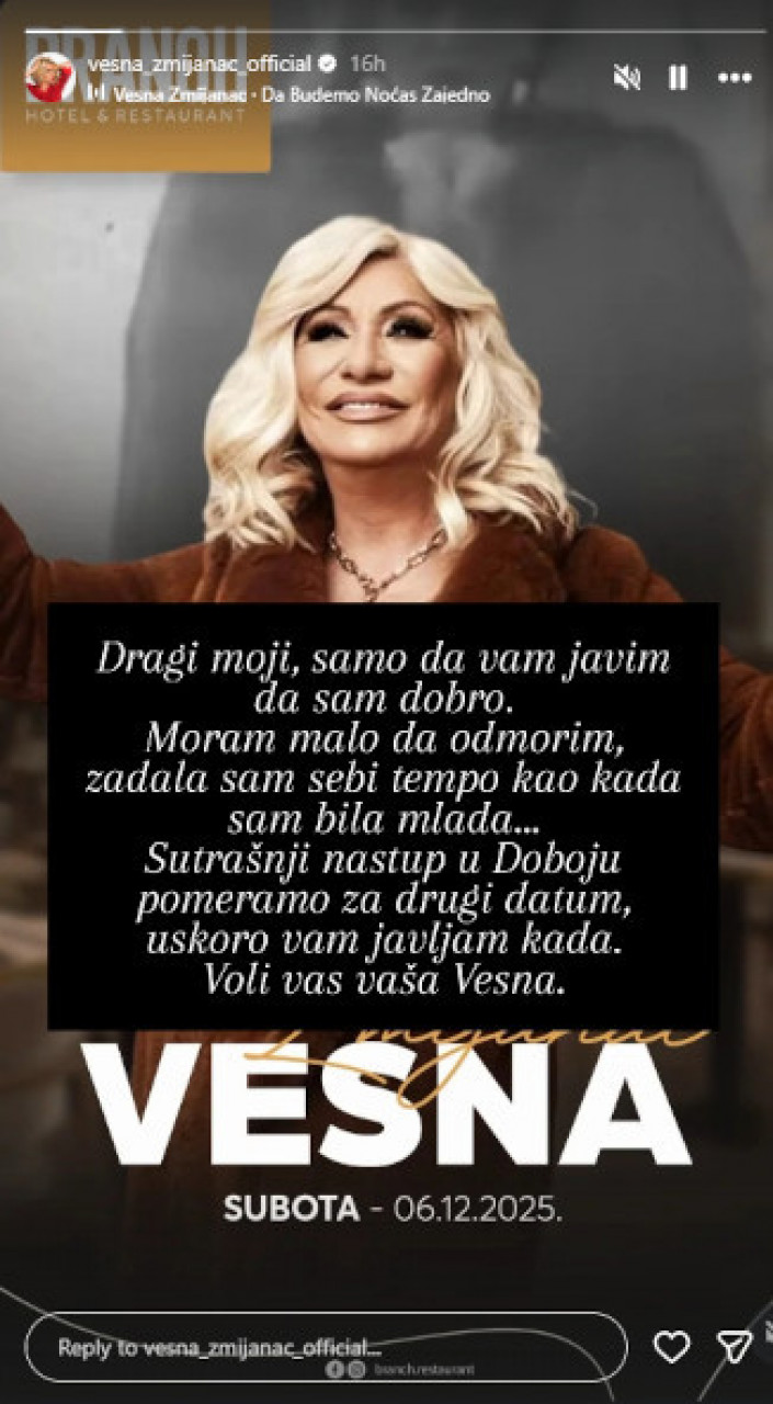 - Dragi moji, samo da vam javim da sam dobro. Moram da odmorim, zadala sam sebi tempo kao kada sam bila mlada. Sutrašnji nastup u Doboju pomeramo za drugi datum, uskoro vam javljam kada. Voli vas vaša Vesna - napisala je ona.