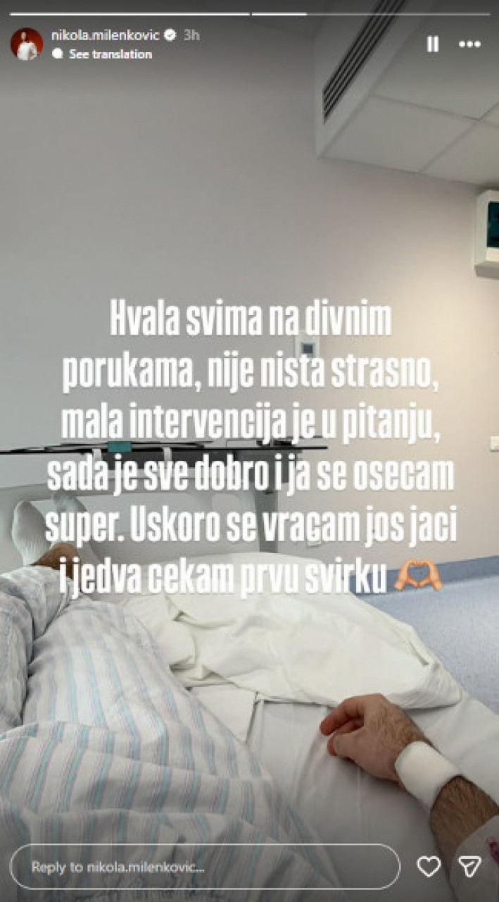 Prema rečima izvora bliskog pevaču, Milenković je prvo osetio jake bolove u donjem desnom delu stomaka, a stanje mu se pogoršavalo tokom noći. Pri prijemu u bolnicu, lekari su ga odmah poslali na hitnu operaciju slepog creva, a intervencija je prošla uspešno.