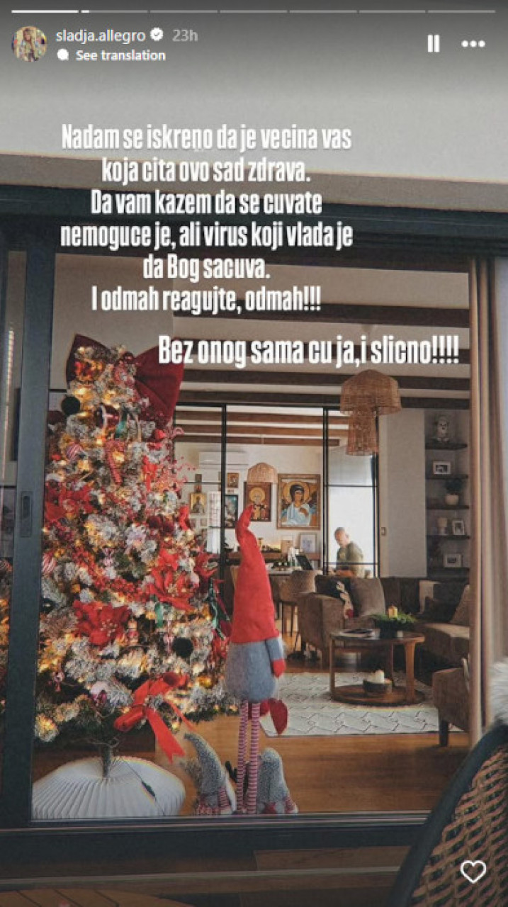 - Nadam se iskreno da je većina vas koja čita ovo sad zdrava. Da vam kažem da se čuvate nemoguće je, ali virus koji vlada je da Bog sačuva. I odmah reagujte, odmah! Bez onog "sama ću ja" i slično! - apelovala je Slađa.