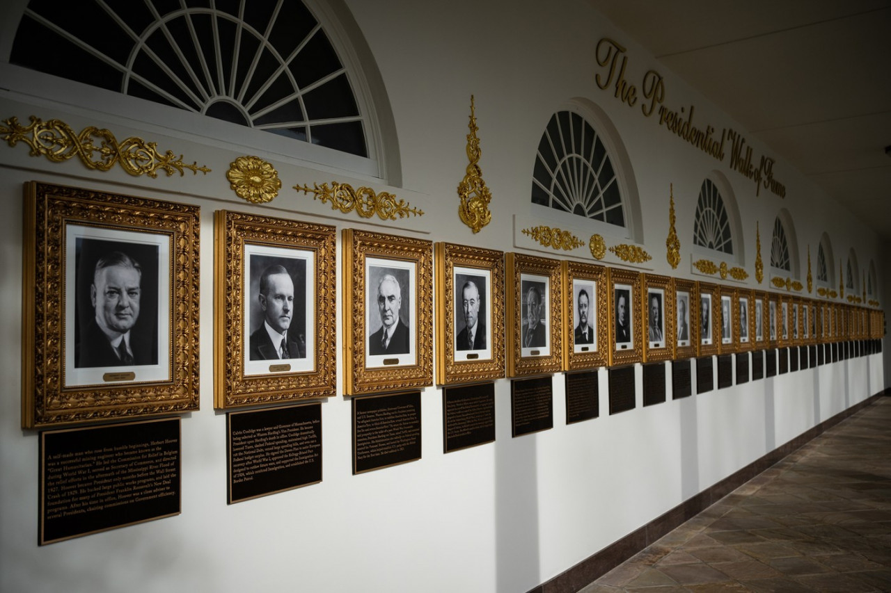 "Predsednička staza slavnih" nedavni je dodatak Beloj kući, a prikazuje portrete duž hodnika između Ovalne sobe i Južnog travnjaka. Portparol Bele kuće, Karolin Livit, rekla je da su pločice "rečit" opis nasleđa svakog predsednika.