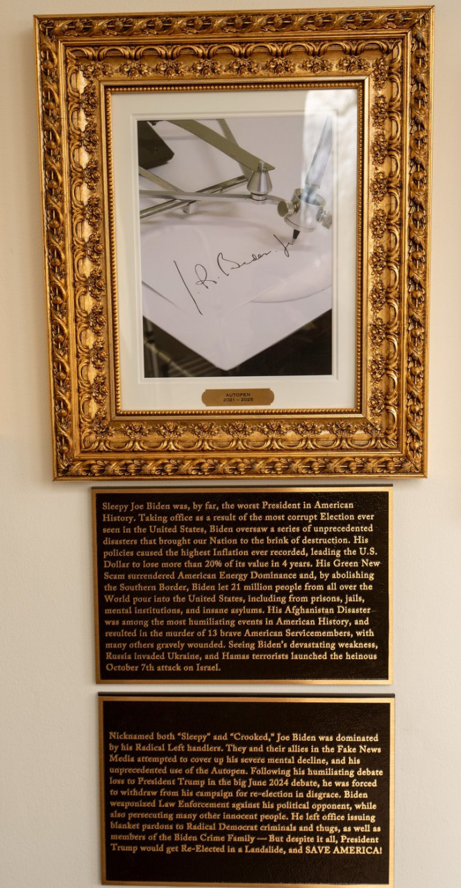 Najžešće optužbe upućene su DŽou Bajdenu, čija pločica nosi natpis: "Pospani DŽo Bajden bio je daleko najgori predsednik u američkoj istoriji." U hodniku u kojem se nalaze portreti svih bivših američkih predsednika, Bajdenova slika zamenjena je fotografijom autopena.