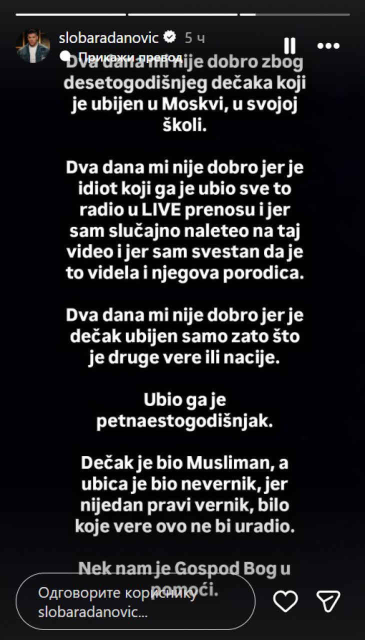 - Dva dana mi nije dobro jer je dečak ubijen samo zato što je druge vere ili nacije. Ubio ga je petnaestogodišnjak. Dečak je bio Musliman a ubica je bio nevernik, jer nijedan pravi vernik bilo koje vere ovo ne bi uradio. Nek nam je gospod Bog u pomoći - napisao je pevač Sloba Radanović u svom storiju na Instagramu.