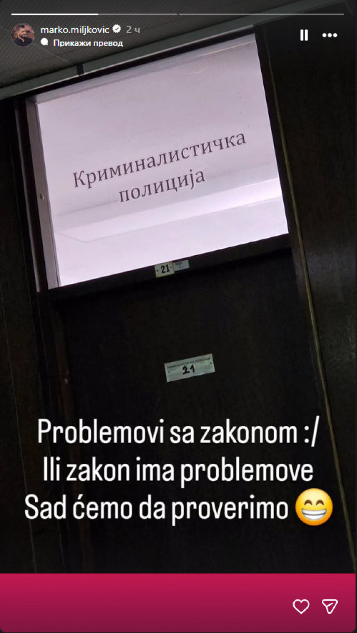 Naime, Miljković se slikao ipred ulaznih vrata na kojima je pisalo "Kriminalistička policija" i ovu objavu podelio na svojoj Instagram objavi uz poruku: