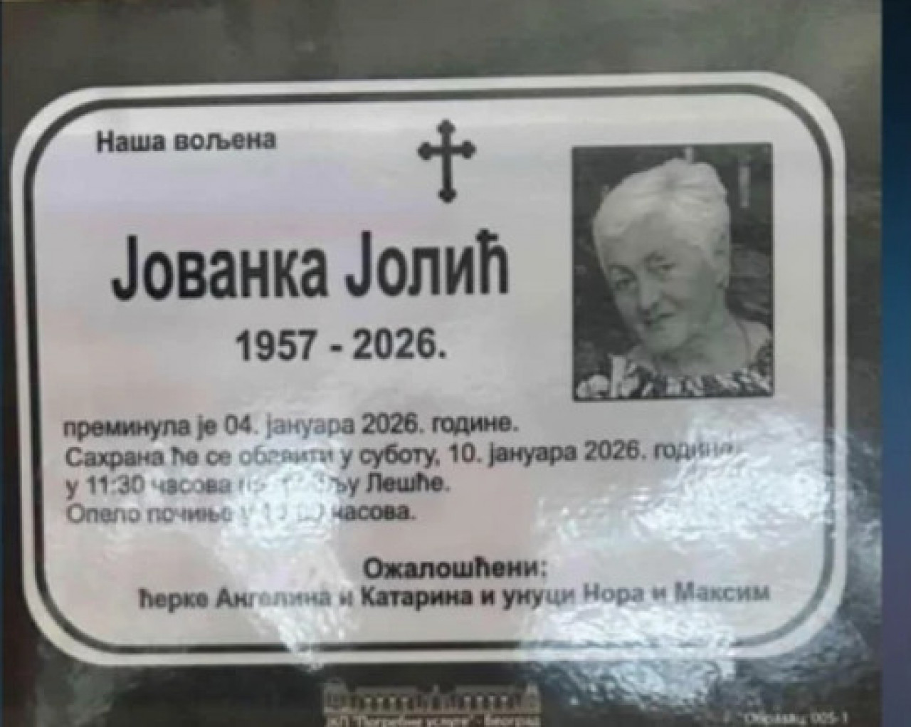 Telo žene pronađeno je te večeri na Voždovcu, a pošto policija nije pronašla lična dokumenta, naknadno je utvrđeno da je u pitanju Jovanka Jolić (69), saznao je i naveo "Blic". Takođe je navedeno da je Jovanka Jolić umrla prirodnom smrću, tako da je telo pokojnice oslobođeno obdukcije i preveženo je u kapelu.