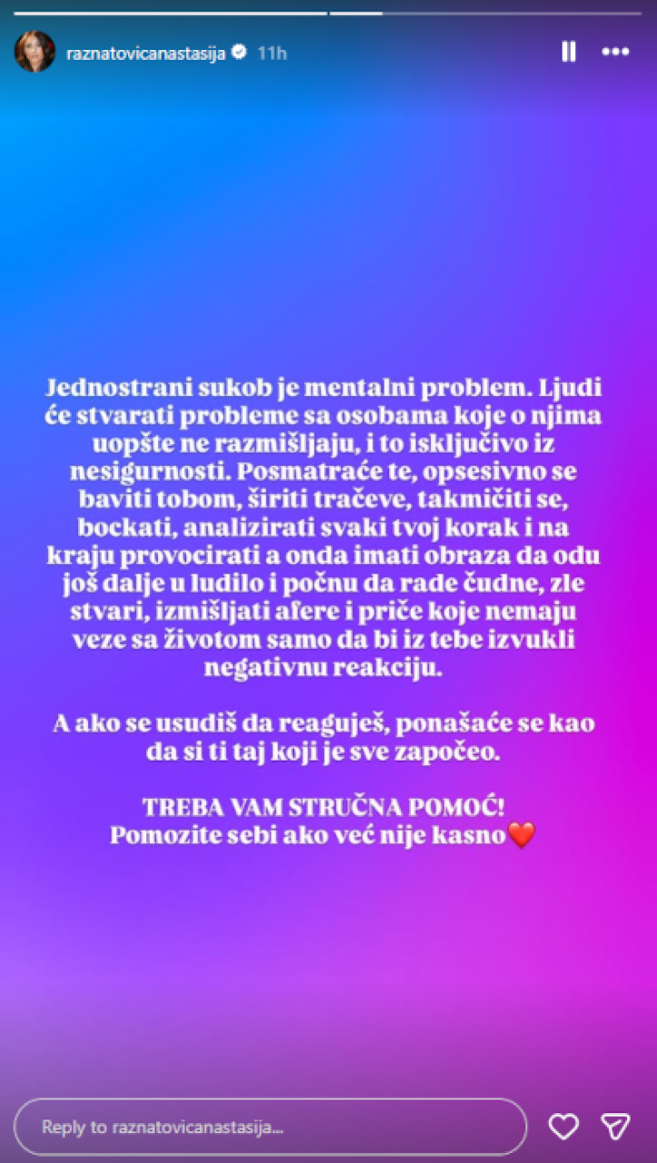 - Jednostrani sukob je mentalni problem. LJudi će stvarati probleme sa osobama koje o njima uopšte ne razmišljaju, i to isključivo iz nesigurnosti. Posmatraće te, opsesivno se baviti tobom, širiti tračeve, takmičiti se, bockati, analizirati svaki tvoj korak i na kraju provocirati, a onda imati obraz da odu još dalje u ludilo i počnu da rade čudne, zle stvari, izmišljati afere i priče koje nemaju veze sa životom samo da bi tebe izvikli negativnu reakciju. A ako se usudiš da reaguješ, ponašaće se kao da si ti taj koji je sve započeo. Treba vam stručna pomoć! Pomozite sebi ako već nije kasno - napisala je Anastasija, a njena majka, folk diva Ceca Ražnatović, se odmah oglasila i na svom profilu na Instagramu podelila ćerkinu objavu.
