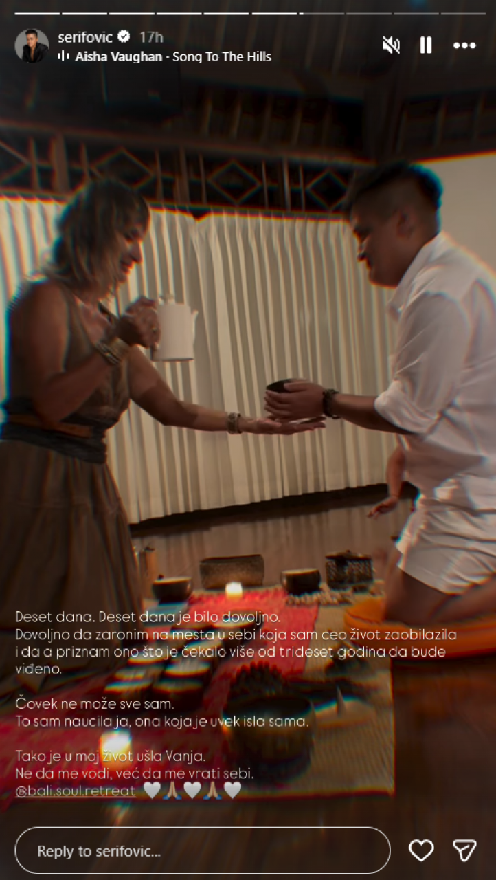 - Deset dana. Deset dana je bilo dovoljno. Dovoljno da zaronim na mesta u sebi koja sam ceo život zaobilazila i da priznam ono što je čekalo više od trideset godina da bude viđeno. Čovek ne može sve sam. To sam naučila ja, ona koja je uvek išla sama. Tako je u moj život ušla Vanja. Ne da me vodi, već da me vrati sebi - napisala je Marija Šerifović.
