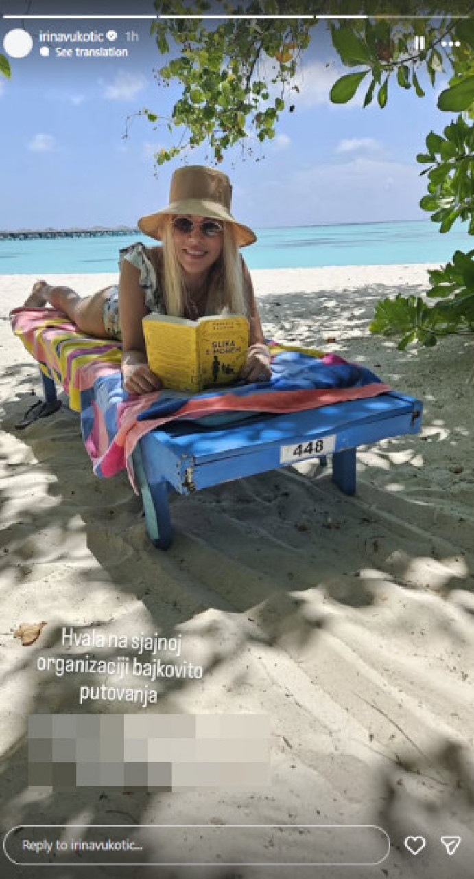 Irina je prvo podelila fotografiju na kojoj je vidimo u jednodelnom kupaćem kostimu kako na stomaku leži na ležaljci i čita knjigu, dok na glavi ima šešir i naočare za sunce. Voditeljka je u opisu otkrila koji deo u knjizi ju je posebno oduševio.
