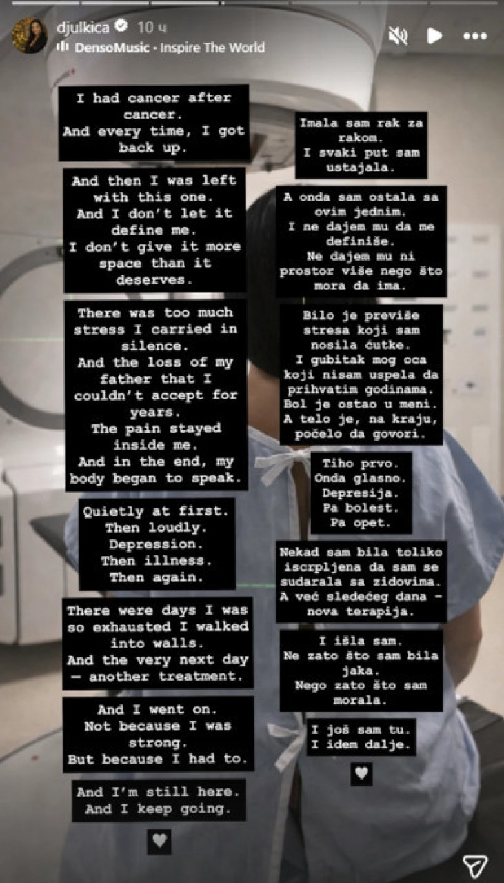 - Imala sam rak za rakom. I svaki put sam ustajala. A onda sam ostala sa ovim jednim. I ne dam mu da me definiše. Ne dajem mu ni prostor više nego što mora da ima. Bilo je previše stresa koji sam nosila ćutke. I gubitak mog oca koji nisam uspela da prihvatim godinama. Bol je ostao u meni, a telo je na kraju počelo da govori. Prvo tiho. Onda glasno. Depresija. Pa bolest. Pa opet. Nekad sam bila toliko iscrpljena da sam se sudarala sa zidovima. A već sledećeg dana - nova terapija. I išla sam. Ne zato što sam bila jaka. Nego zato što sam morala. I još sam tu. I idem dalje.