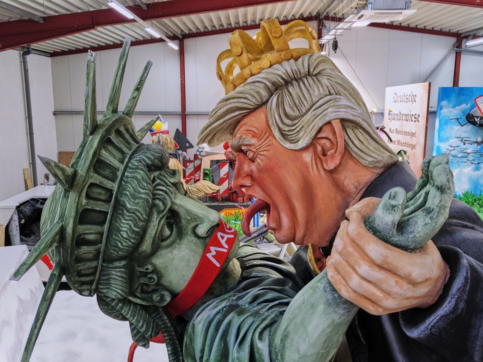 Druga kola, na primer, prikazuju dečaka s mobilnim telefonom koji nosi preveliku vojnu kacigu. To je komentar na činjenicu da naročito mladići često odlaze u vojsku ne znajući u šta se upuštaju. Tu su i giljotina prekrivena krvlju sa natpisom "US Tariffs", čije sečivo čini američka zastava, kao i zec s natpisom "EU", koji nosi teške tegove pod budnim okom SAD (prikazanog kao orao), Rusije (medved) i Kine (panda). Prateći slogan poručuje da će se EU snaći i bez moćnika. Sve su to teme ovogodišnjeg karnevala.