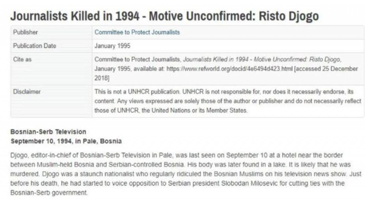 “Risto Đogo, glavni i odgovorni urednik Televizije Republike Srpske, nije u noći između 9. i 10. septembra 1994. pao s visoke terase zvorničkog hotela „Vidikovac“ u Drinu i udavio se. On je ubijen.”