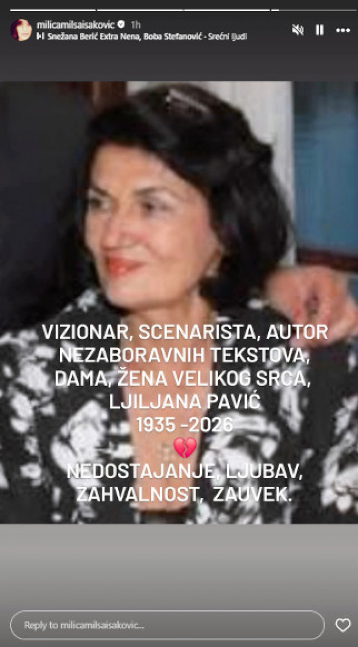 - Vizionar, scenarista, autor mnogobrojnih tekstova, dama žena velikog srca, LJiljana Pavić,1935- 2026. godine. Nedostajanje, ljubav, zahvalnost, zauvek- napisala je Milica uz emotikon slomljenog srca.