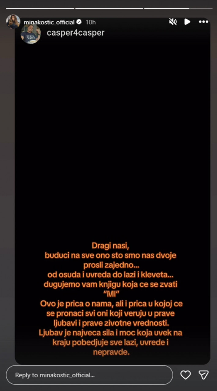 - Dragi naši, budući na sve ono što smo nas dvoje prošli zajedno, od osuda i uvreda do laži i kleveta, dugujemo vam knjigu koja će se zvati "Mi". Ovo je priča o nama, ali i priča u kojoj će se pronaći svi oni koji veruju u prave ljubavi i prave životne vrednosti. LJubav je najveća sila i moć koja uvek na kraju pobeđuje sve laži, uvrede i nepravde - napisali su oni u obraćanju na Instagramu.