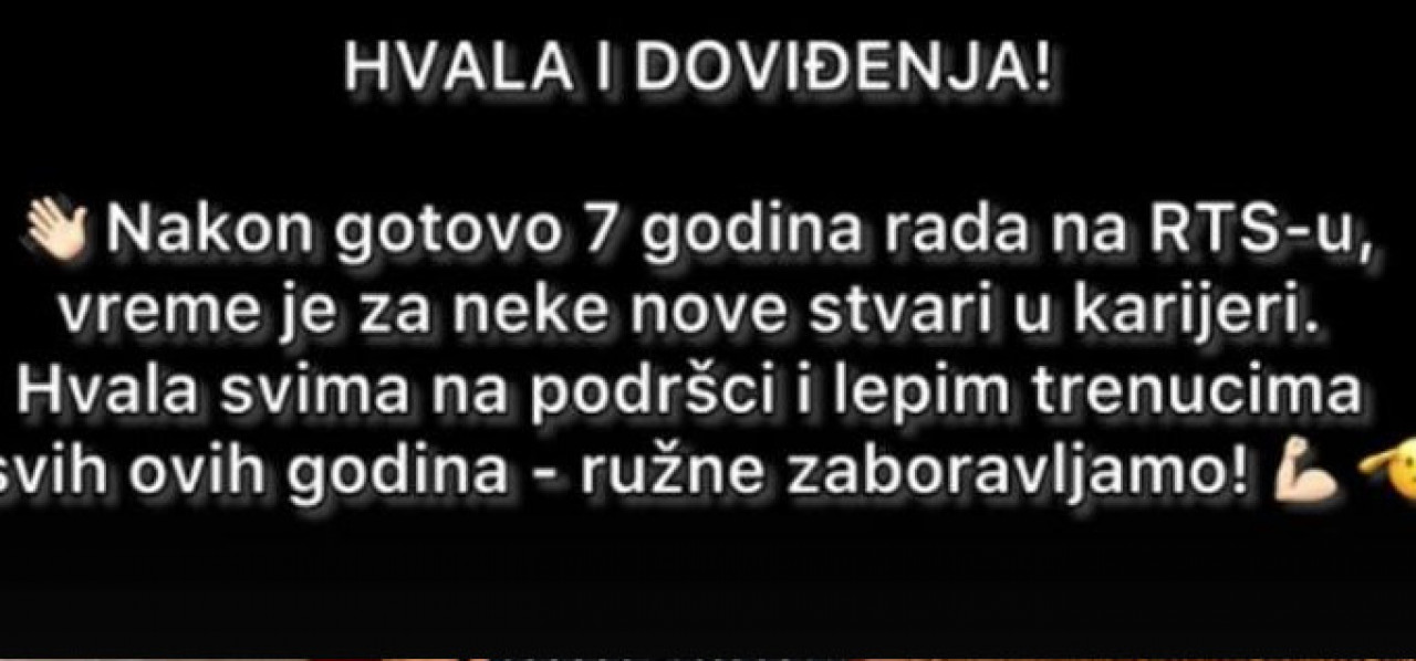 - Hvala i doviđenja. Nakon gotovo 7 godina rada na RTS-u, vreme je za neke nove stvari u karijeri. Hvala svima na podršci i lepim trenucima svih ovih godina - ružne zaboravljamo - napisao je on u objavi na Instagramu.