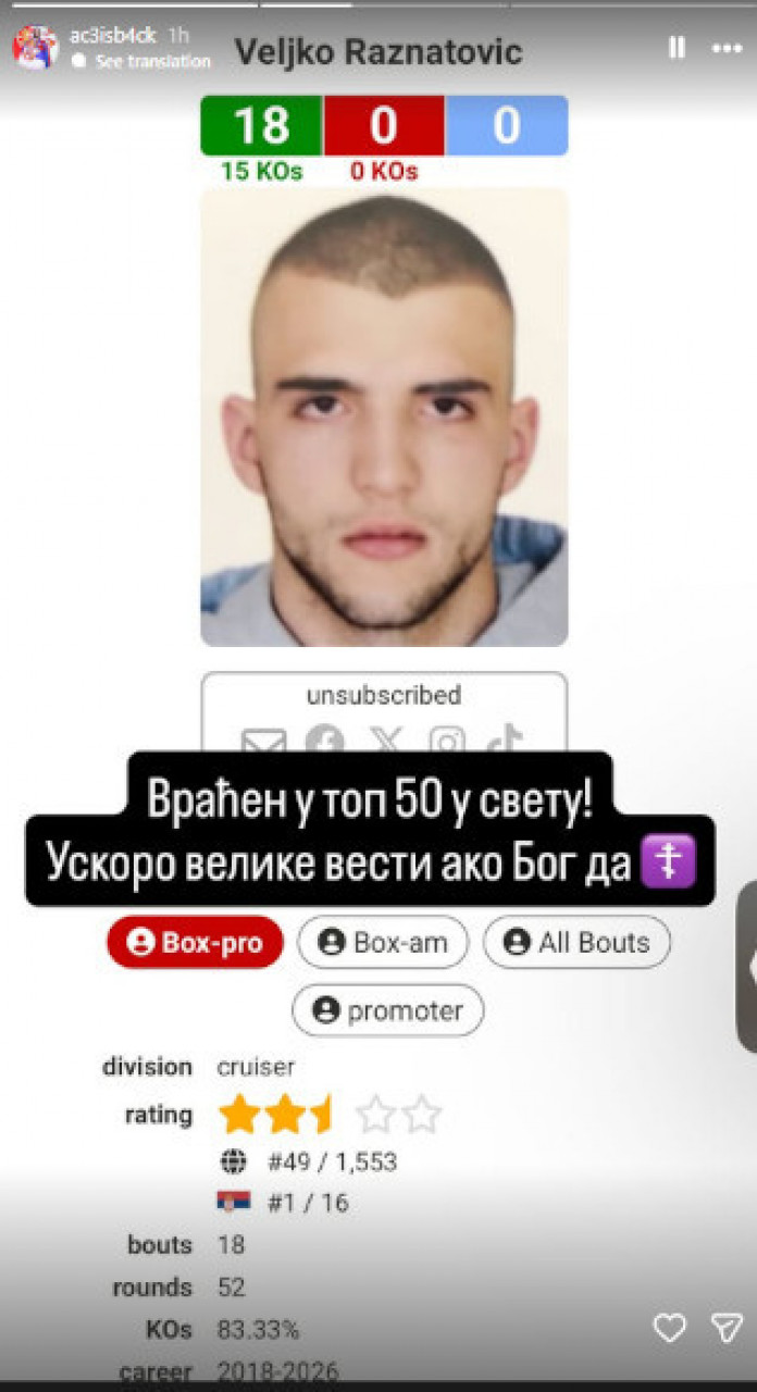 - Vraćen u top 50 u svetu! Uskoro velike vesti ako Bog da - napisao je Veljko.