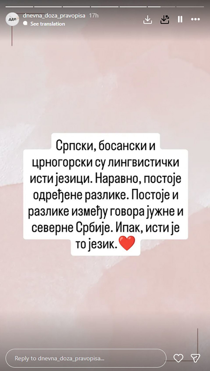 "Srpski, bosanski i crnogorski su lingvistički isti jezici. Naravno, postoje određene razlike. Postoje i razlike između govora južne i severne Srbije. Ipak, isti je to jezik", piše u objavi.