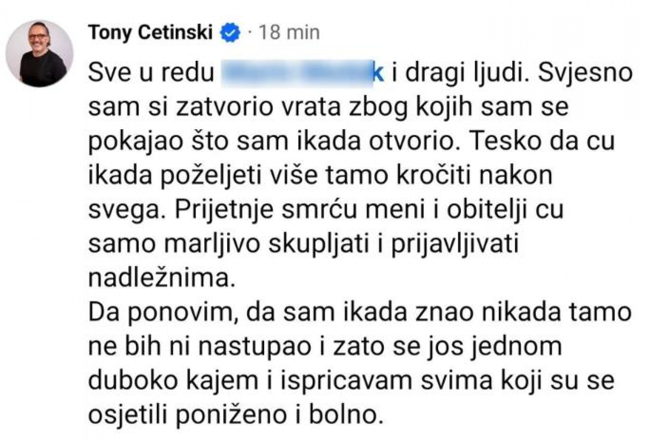 Podsetimo, zbog stava Tonija Cetinskog i navoda da je dvorana nekada bila logor, mnogi njegovi fanovi su besni pa svakodnevno ostavljaju komentar ispod njegove objave na mrežama, u kojoj je napisao zašto je doneo odluku da otkaže koncert.