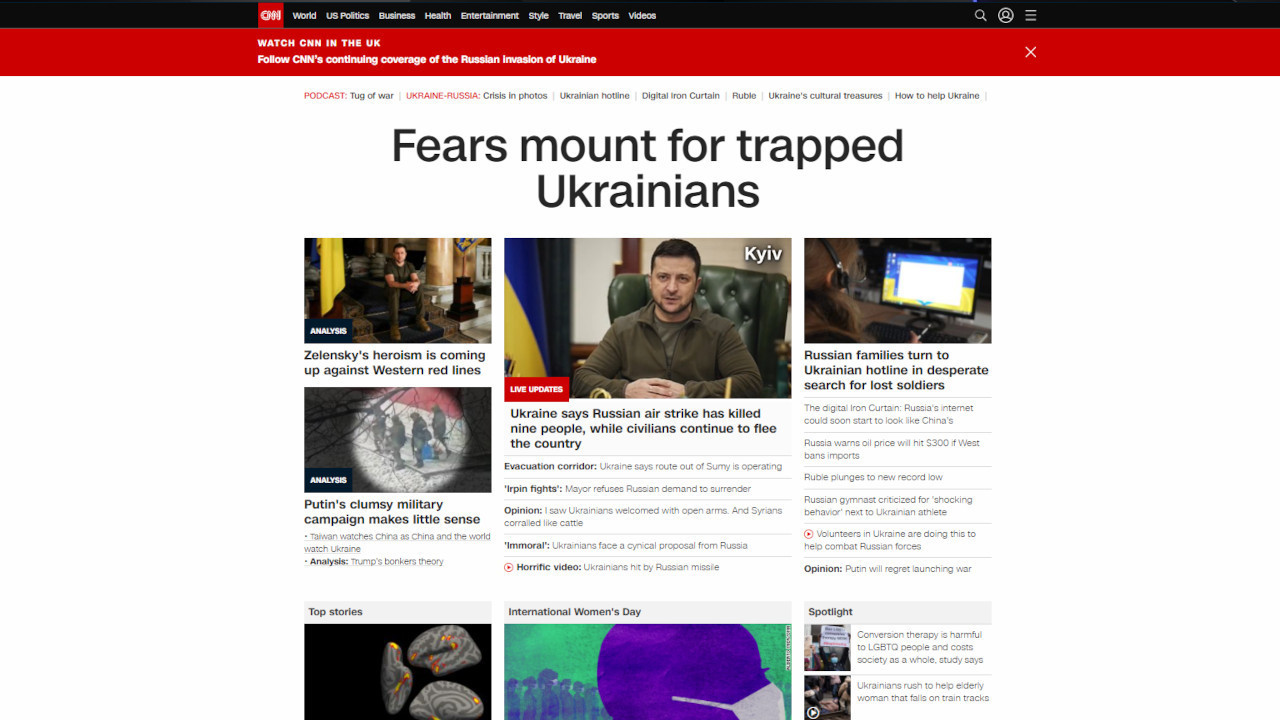 I američki NJujork Tajms pažnju posvećuje događajima u Ukrajini. Ističe se da su ukrajinske snage navodno uspele da zadrže rusko vojno napredovanje, ali uz civilne gubitke. Takođe, govori se o navodnom medijskom i digitalnom mraku u Rusiji i teškoj situaciji kroz koju prolaze civili u Ukrajini.