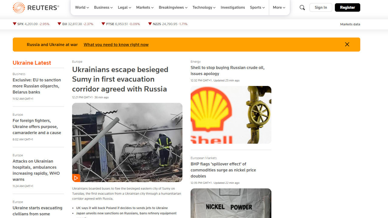 Rojters piše o humanitarnom koridoru u Sumi, kao o prvom takvom koji je nastao dogovorom dve zaraćene strane. Takođe, prenose se vesti o novim sankcijama za ruske i beloruske oligarhe i činjenica da je naftna kompanija Šel odustala od kupovine ruskih energenata.