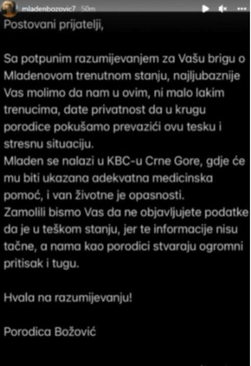 Povodom toga oglasila se porodica crnogorskog golmana putem Instagrama Mladena Božovića.