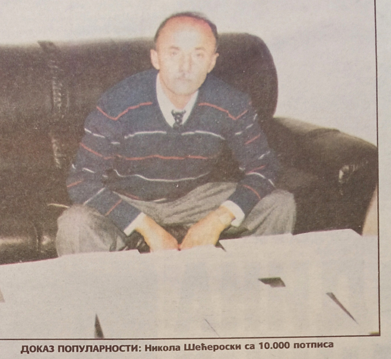 Tog trenutka se telefonom javlja koleginica iz jednog dnevnog lista, pokušavajući da ugovori susret u redakciji. Šećeroski se koleba. Uoči ovih izbora valja skupiti 10.000 potpisa, pa mu je svaki trenutak dragocen. Otvoreno kaže da nema mnogo poverenja u novinare. Kad je završio razgovor, objašnjava: