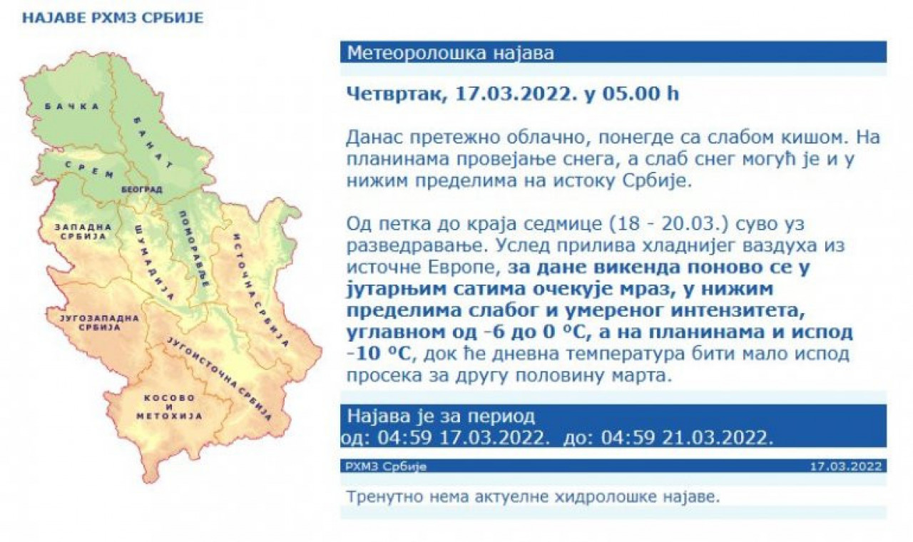 Od petka do kraja sedmice suvo uz razvedravanje. Usled priliva hladnijeg vazduha iz istočne Evrope, za dane vikenda ponovo se u jutarnjim satima očekuje mraz, u nižim predelima slabog i umerenog intenziteta, uglavnom od -6 do 0 stepeni, a na planinama i ispod -10 stepeni, dok će dnevna temperatura biti malo ispod proseka za drugu polovinu marta.