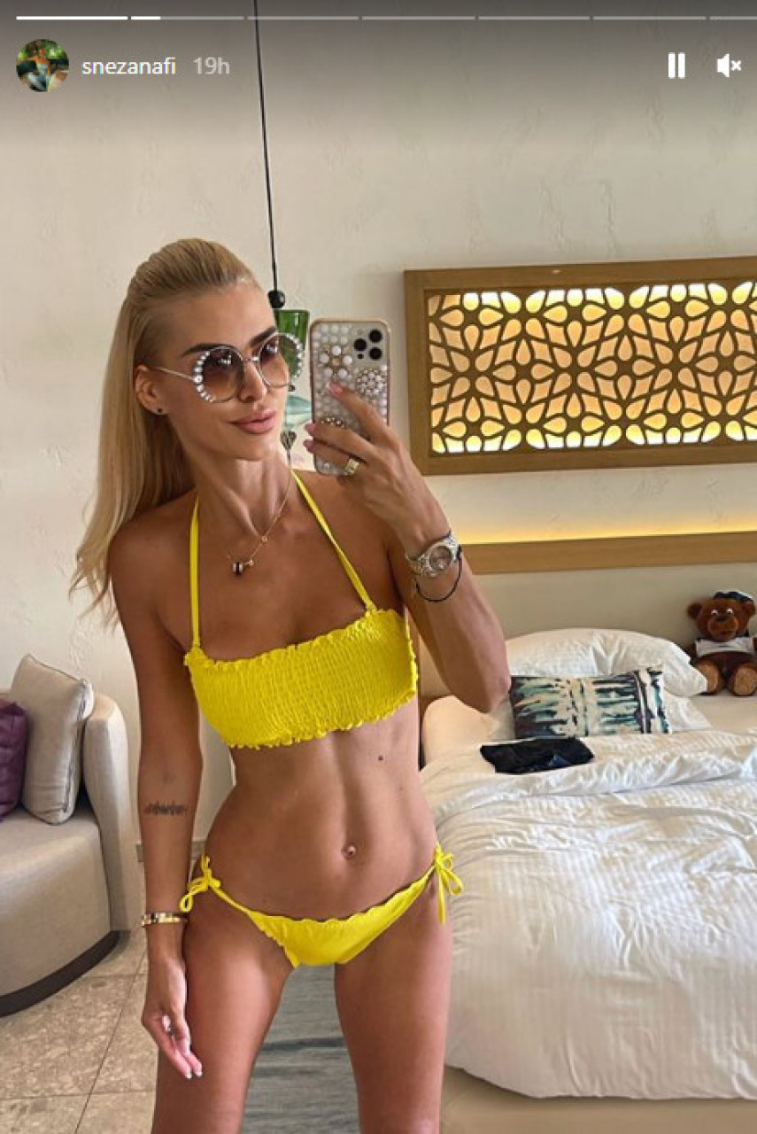 Nakon letovanja sa druagricama, supruga Milana Borjana otputovala je na još jedan odmor i sa pratiocima odmah podelila prve kadrove. Sneža se snimala u žutom bikiniju - prvo u sobi, a potom i u bazenu.