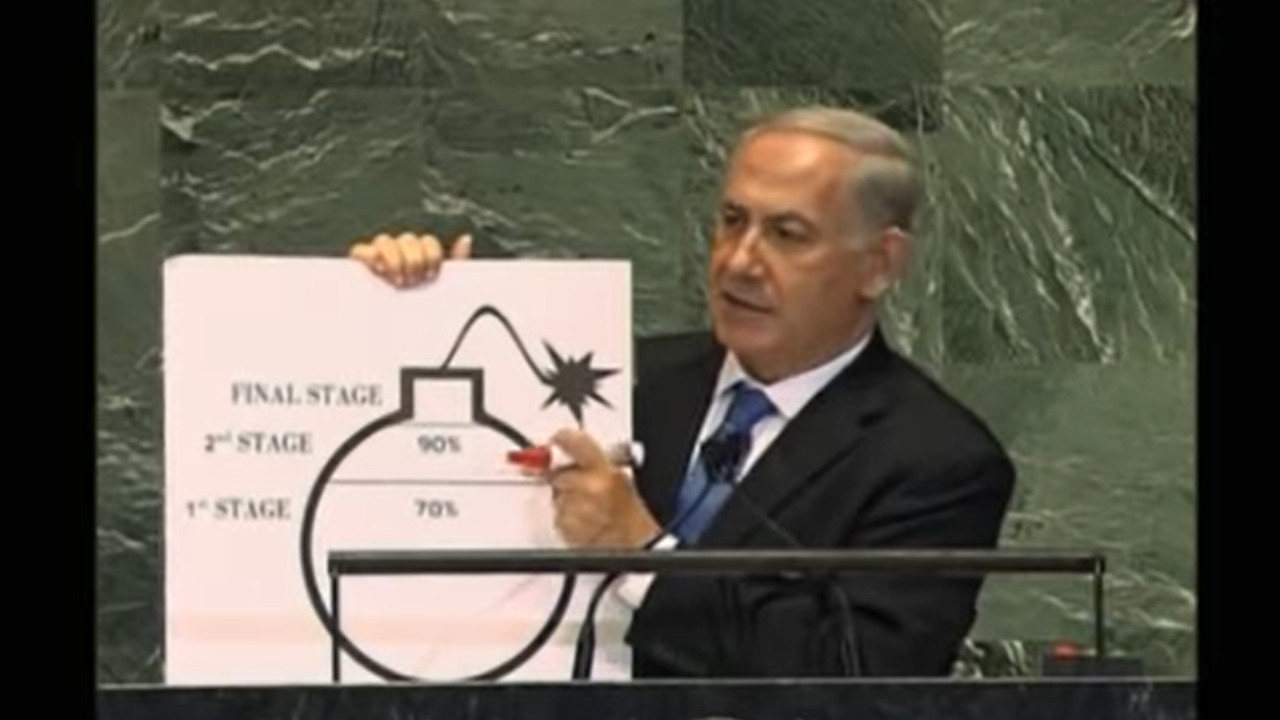Nekadašnji izraelski premijer, Benjamin Netanjahu, koristio je kartonski model bombe 2012. godine kako bi UN pozvao da reaguju zbog iranskog razvoja nuklearnog oružja.