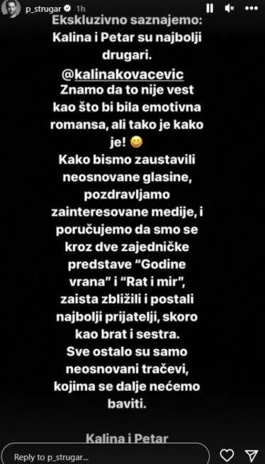 "Kalina i Petar su najbolji drugari. Znamo da to nije vest kao što bi bila emotivna romansa, ali tako je kako je. Kako bismo zaustavili neosnovane glasine, pozdravljamo zainteresovane medije i poručujemo da smo kroz dve zajedničke predstave zaista približili i postali najbolji prijatelji, skoro kao brat i sestra. Sve ostalo su neosnovani tračevi", napisao je Strugar na Instagramu.