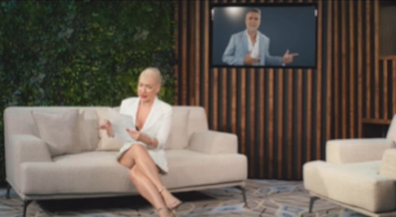 Obučena u elegantno, belo odelo, Jovana glumi besnu voditeljku koja psuje saradnike verujući da su joj podmetnuli lažnu vest da je slavni sportista u Beogradu.