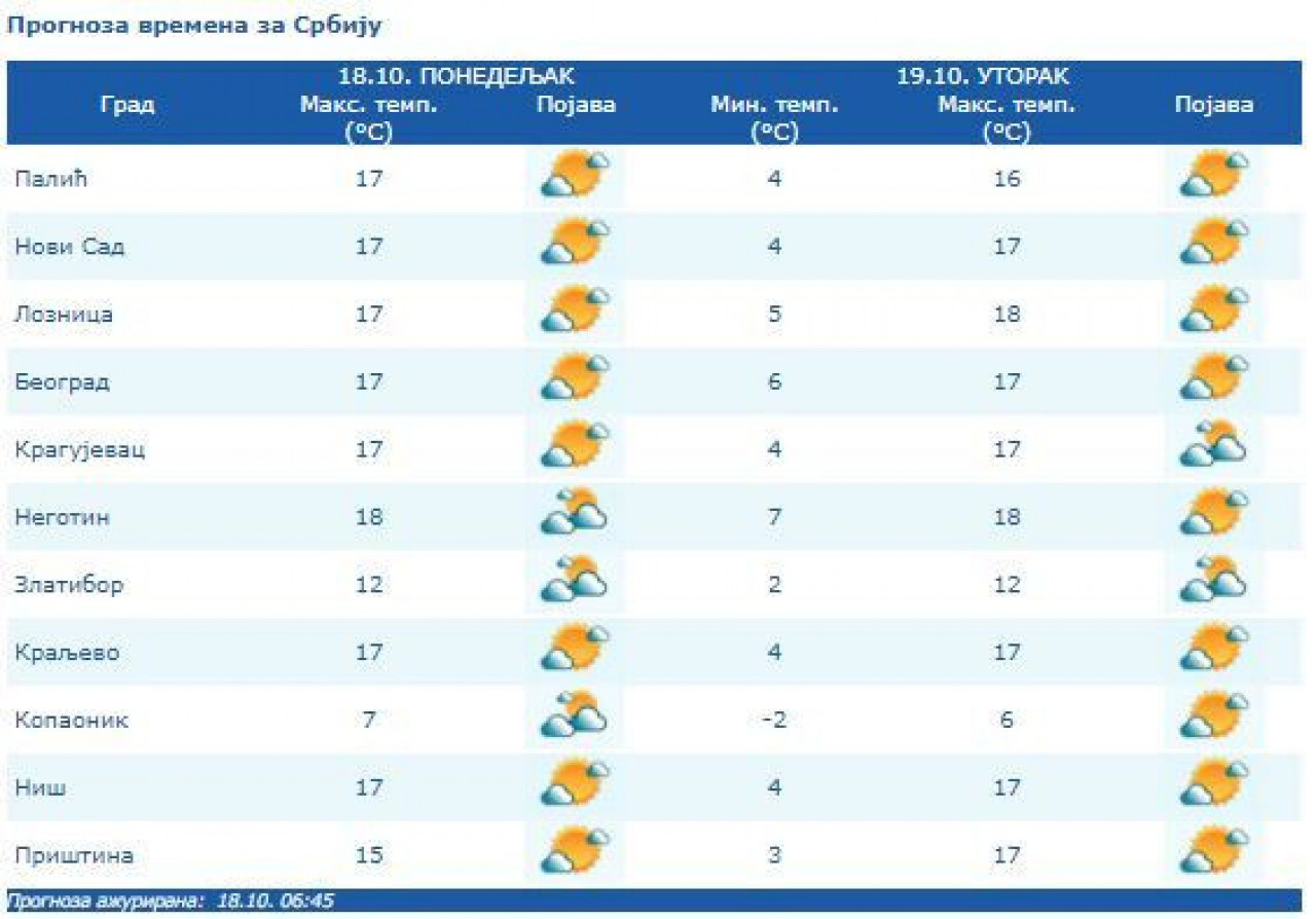 Vetar slab do umeren, severozapadni. Jutarnja temperatura od dva do sedam, najviša dnevna od 14 do 18 stepeni, saopštio je Republički hidro-meteorološki zavod.