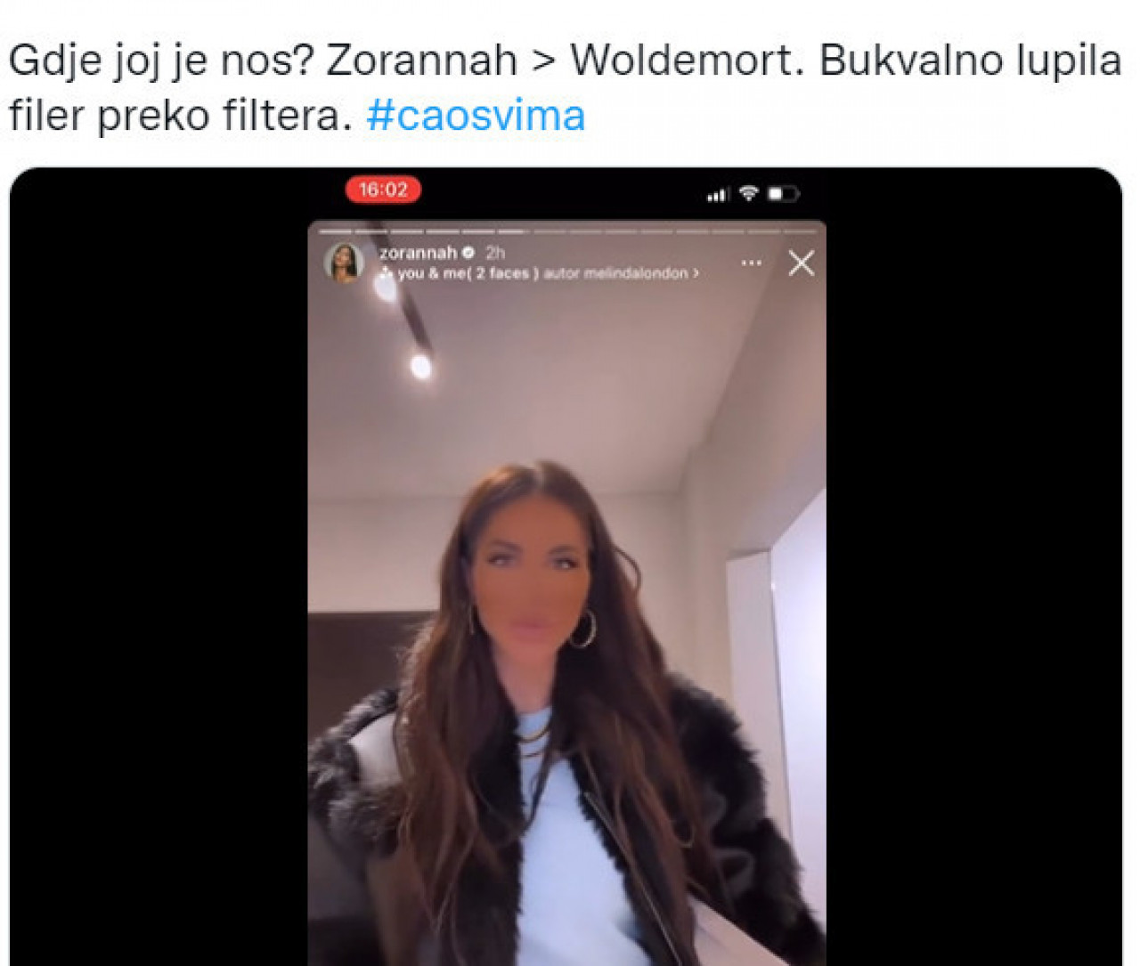 "Gde joj je nos? Zorana ista Voldemort. Bukvalno lupila filter preko filtera", glasio je komentar jednog korisnika Tvitera.