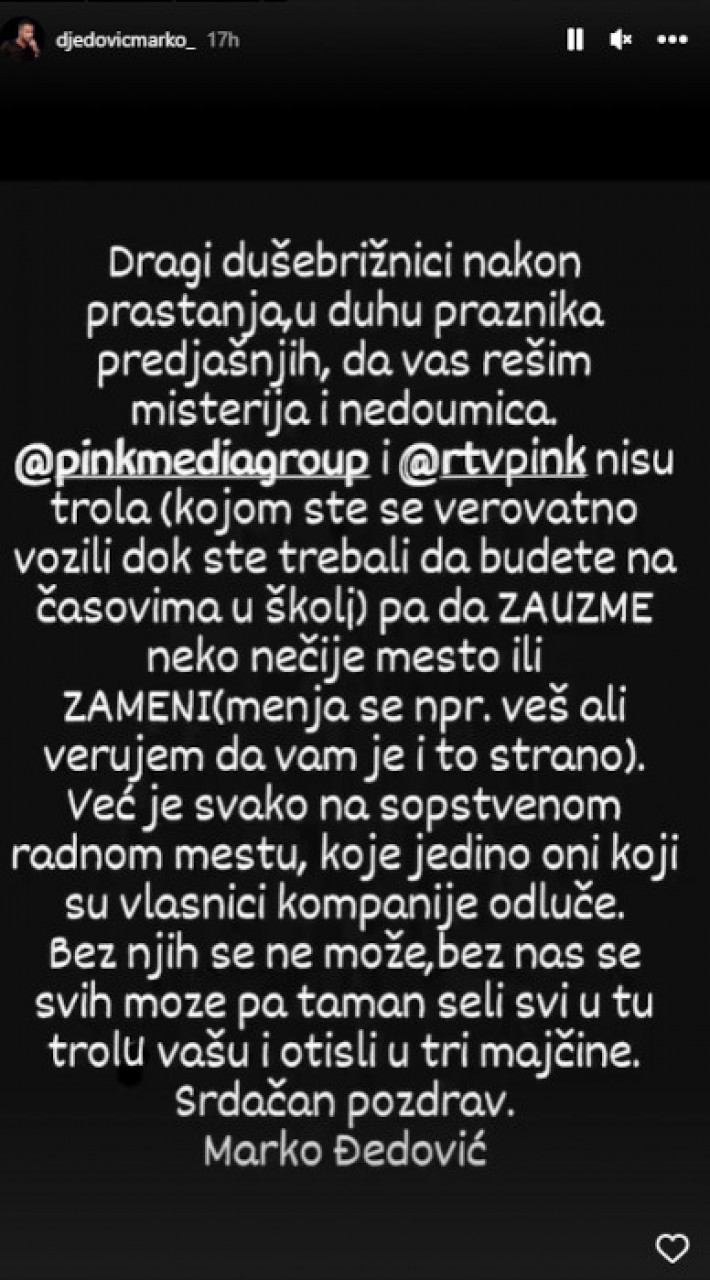 - Dragi dušebrižnici nakon praštanja, u duhu proznika pređašnjih, da vas rešim misterija i nedoumica. Pink nije trola (kojom ste se verovatno vozili dok ste trebali da budete na časovima u školi) pa da zauzme neko nečije mesto ili zameni (menja se npr. veš ali verujem da vam je i to strano). Vec je svako na sopstvenom radnom mestu, o kojem jedino oni koji su vlasnici kompanije odluče. Bez njih se ne može, bez nas se svih može pa taman seli svi u tu trolu vašu i otišli u tri majčine. Srdačan pozdrav, napisao je Đedović na svom Instagram profilu.