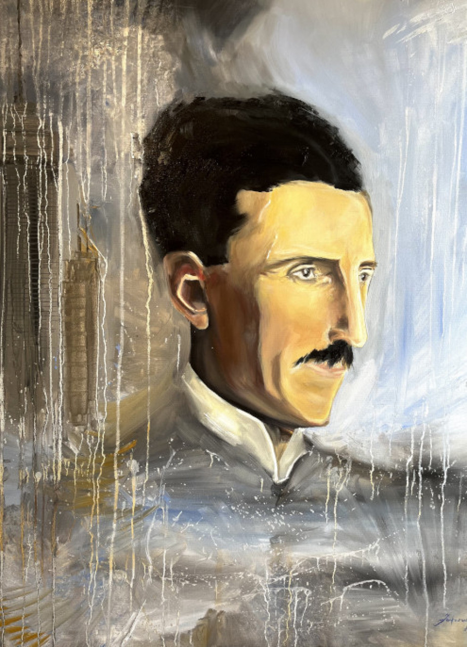 Aleksandar Ignatović, čovek koji je primetio moj rad i trud, maksimalno mi je pomogao u ostvarivanju projekta. Svest o Teslinom postojanju je od izuzetne važnosti za čitav svet. Sve što se vidi na slici, rađeno je namerno. NJegov lik namerno je rađen toplim blagim bojama koje znače svetlost, pozadinu koja je sa desne strane plava i čista pokazuje dobru stranu ovog sveta,a sa leve siva,tamna pokazuje kako lošu stranu tako i Teslinu prošlost, teške i siromašne trenutke. Žućkaste mrlje u levom donjem uglu znače da i u svetu tame i siromaraštva opet postoji nada. Kapljice boje na njegovom odelu pokazuju koliko je ovozemaljsko materijalno prolazno,tako da bi poruka slike bila da će ovaj svet večno obasjavati Teslino lice,neprolazno i dragoceno.