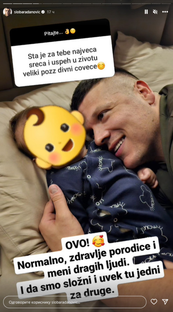 Jedno u nizu bilo je pitanje šta za njega predstavlja najveću sreću i uspeh u životu, a Sloba je odgovorio fotografijom svog sina i napisao: